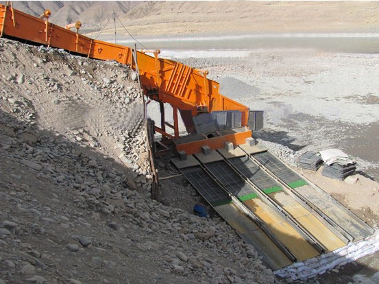 2、采用偏心軸振動篩進行篩分。粗料篩出后直接排走。 細料根據(jù)礦體情況選配:離心選礦機、鼓動溜槽、蠕動溜槽、振動溜槽等選金設(shè)備。