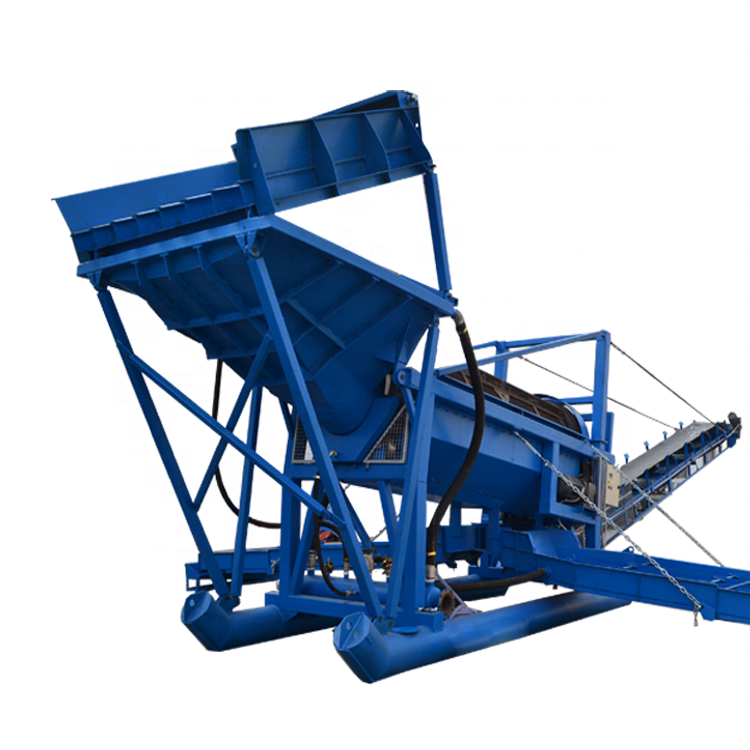 本套移動式選金設備為管式底座,本套底座適用于含泥量高的礦區。礦區含泥量高如果用輪式底座不容易拖動,用管式底座或船體式則移動容易。上料斗為含錳強度硬鋼材焊接而成,含泥量較高的礦區可加脫泥筒。分離篩可根據礦料性質采用鋼筋編織型或鐵板沖孔型。鐵板沖孔型為強度鐵板,采用激光沖孔。