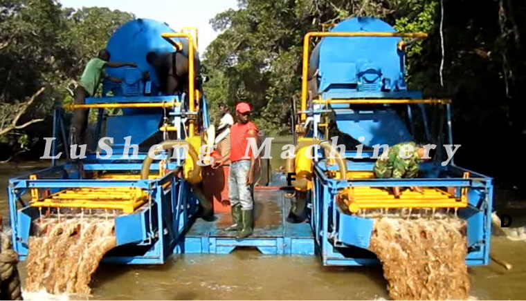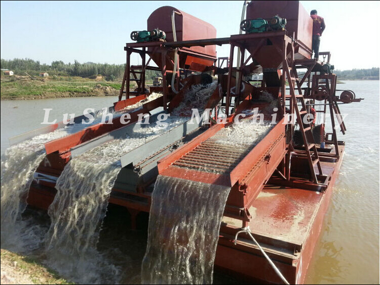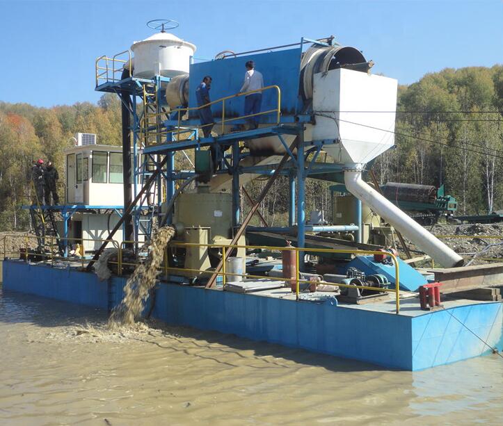挖斗淘金船、抽沙淘金船、絞吸式淘金船,這三種中產量可以定制,挖斗淘金船的產量每小時可達300立方,抽沙淘金船和絞吸式淘金船可以達到700立方。也可以定制為普通的產量,比如每小時100m或每小時200m或者更小產量,都是可以的。 這三種船上都有選金系統,可以定制選金系統。可以根據礦料情況配套離心機、鼓動溜槽、蠕動溜槽、振動溜槽等回收黃金。